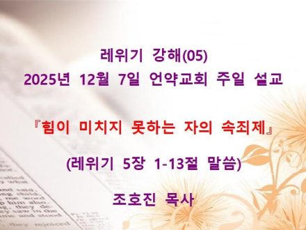 2025년 12월5일 언약교회 주일예배 설교입니다. 제목: 『힘이 미치지 못하는 자의 속죄제』 본문: 레위기 5장 1-13절 말씀