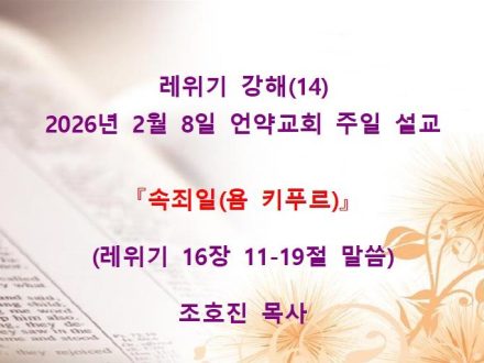 2026년 2월8일 언약교회 주일예배 설교입니다. 제목: 『속죄일(욤 키푸르)』 본문: 레위기 16장 11-19절 말씀