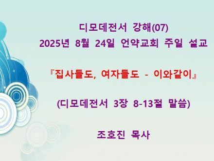 2025년 8월24일 언약교회 주일예배 설교입니다. 제목: 『집사들도, 여자들도 – 이와같이』 본문: 디모데전서 3장 8-13절 말씀