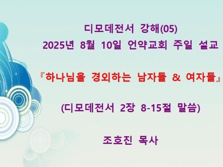 2025년 8월10일 언약교회 주일예배 설교입니다 제목: 『하나님을 경외하는 남자들 & 여자들』 본문: 디모데전서 2장 8-15절 말씀