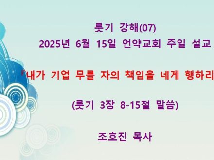 2025년 6월15일 언약교회 주일예배 설교입니다. 제목: 『내가 기업 무를 자의 책임을 네게 행하리라』 본문: 룻기 3장 8-15절 말씀