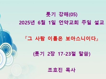 2025년 6월1일 언약교회 주일예배 설교입니다. 제목: 『그 사람 이름은 보아스니이다』 본문: 룻기 2장 17-23절 말씀   – 오늘 설교 동영상은, 후반 10분쯤 음성이 나오지 않습니다. 양해해 주시기 바랍니다 –