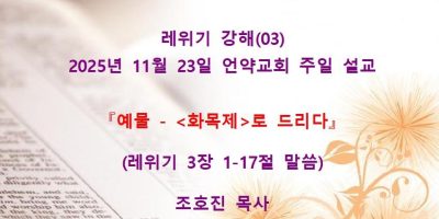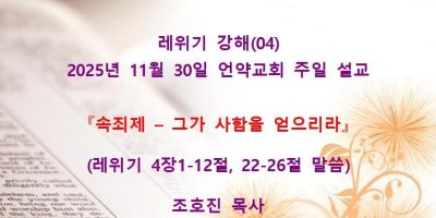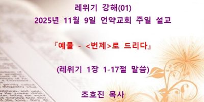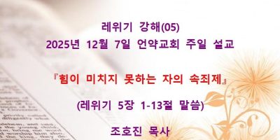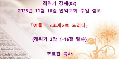 2026년 1월4일 언약교회 주일예배 설교입니다. 제목: 『그들이 여호와 앞에서 죽은지라』 본문: 레위기 10장 1-7절 말씀 Read More →