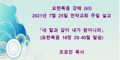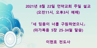 2021년 8월22일 언약교회 주일예배 설교입니다(오전11시, 오후3시) 제목 – 『네 믿음이 너를 구원하였으니』 본문 – 마가복음 5장 25-34절 말씀 설교자 – 이현호 전도사 Read More →